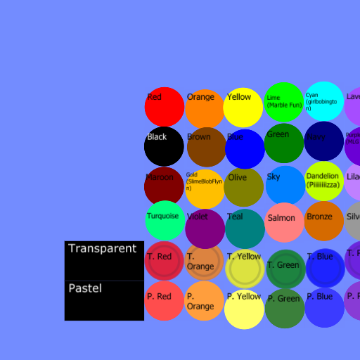 T.Yellow, T.Green, T.Blue, T.Purple, T.Pink, T.Brown, P.Red, P.Orange, P.Yellow, P.Green, P.Blue, P.Purple, P.Pink, and