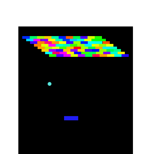 This is another version of my phun breakout game I made. Arrow keys move paddle. I tested it and it seems to bounce well each time with a constant similar speed each bounce. If you want to make it harder, try dragging the ball faster to the paddle to start. Instead of breakout on a gameboy, this time it's just classic with a black backround, white boarders, and colorfull bricks. It seems to do very well with destroying the blocks each time, maybe once out of all the times I tested it, that one brick didn't break. Have PHUN!  |