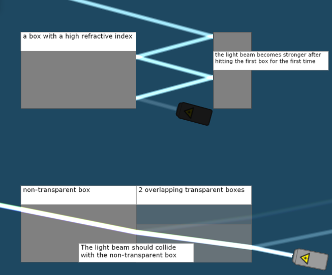 I agree that the first one isn't very good behavior. The cause is that when a non-pure laser (any laser with saturation<1) hits anything, it is broken up into the colors of the rainbow, and those colors don't always sum up to the original laser color. I will improve upon this in the next beta, though the fix won't be perfect.